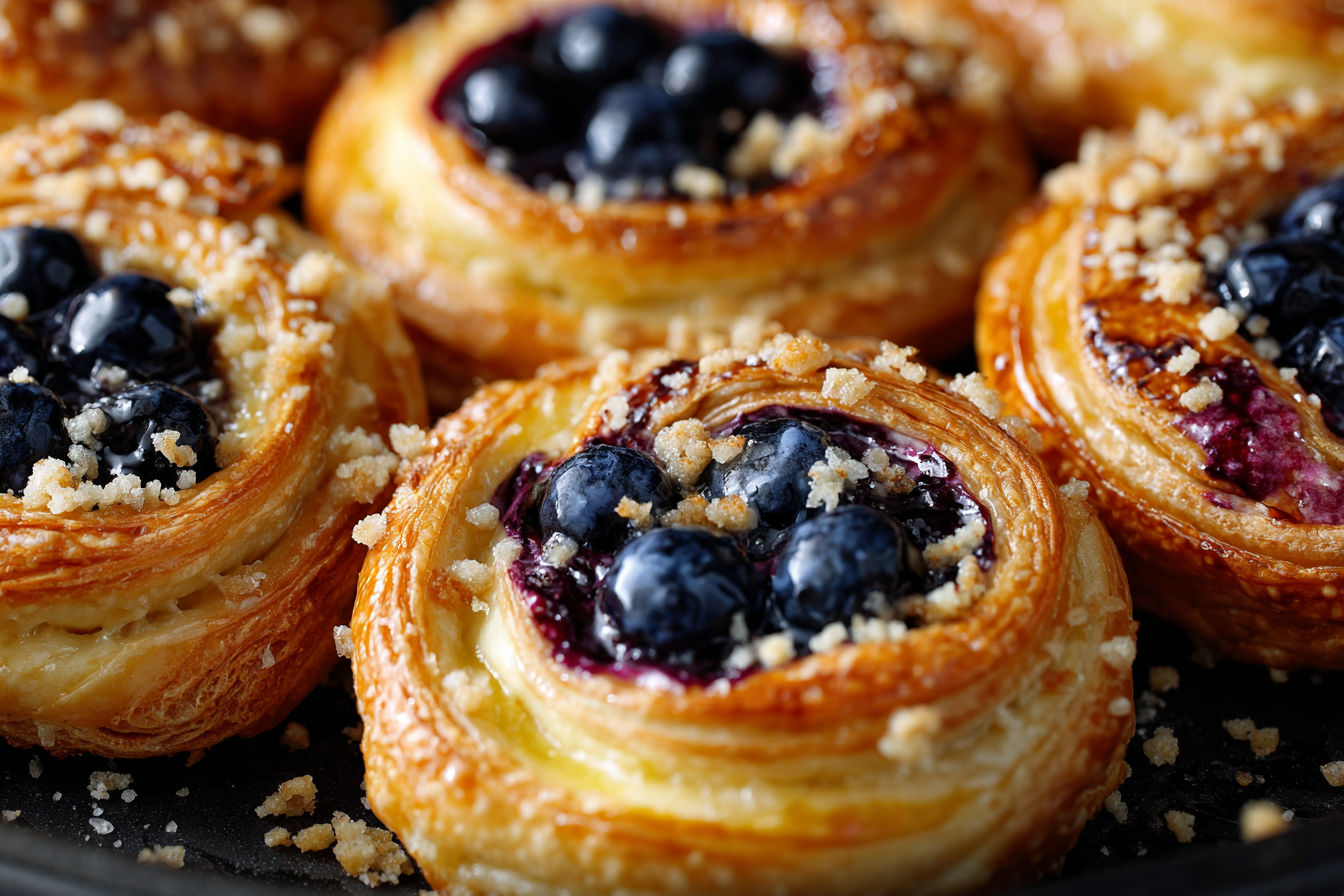 The pastry bakes into crisp, buttery folds that contrast beautifully with the smooth, lightly sweetened cream cheese center. Juicy blueberries soften and release their natural sweetness as they cook, creating a vibrant topping that balances richness with freshness.