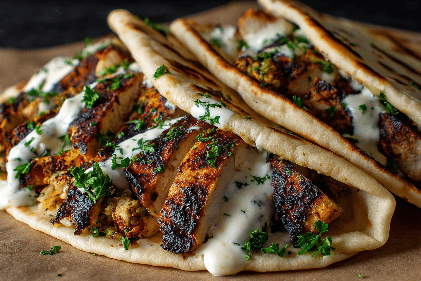 Easy Homemade Chicken Shawarma with Creamy Garlic Sauce features tender spiced chicken served with a smooth and tangy garlic sauce for wraps or bowls.