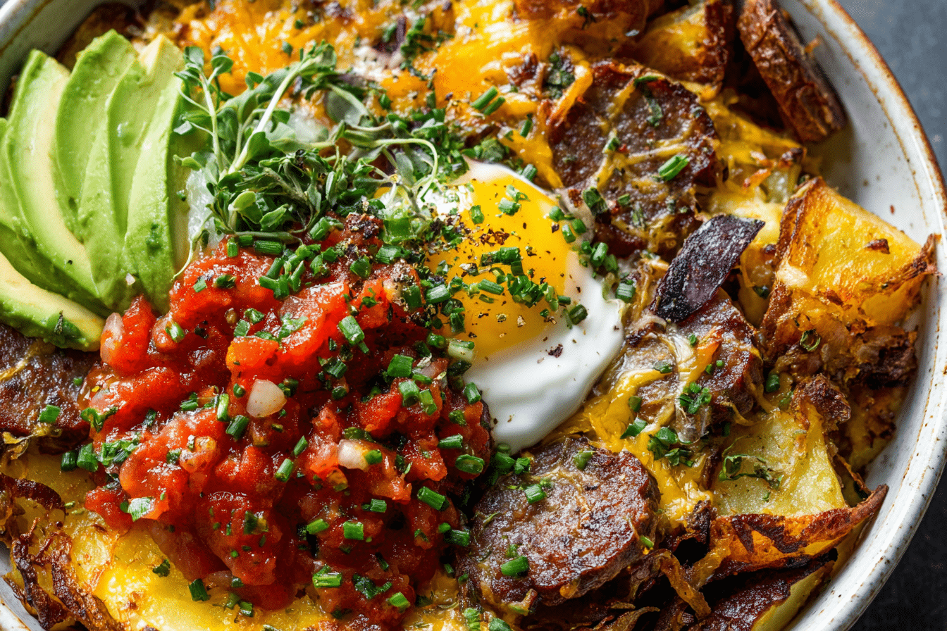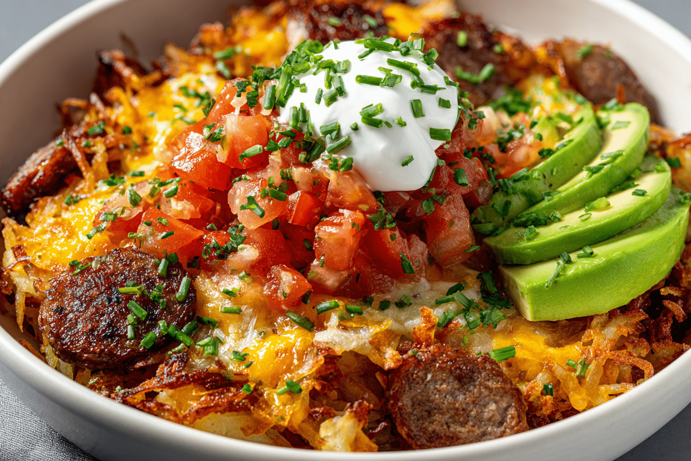 This dish fits both relaxed weekend brunches and busy weekday starts. The components cook in stages, then come together in layers that hold warmth and texture beautifully. Loaded Hash Brown Breakfast Bowls with Sausage & Egg feel hearty without being heavy, delivering balanced flavor through thoughtful seasoning and simple preparation. Once assembled, the bowl becomes a complete meal that satisfies from the very first bite.