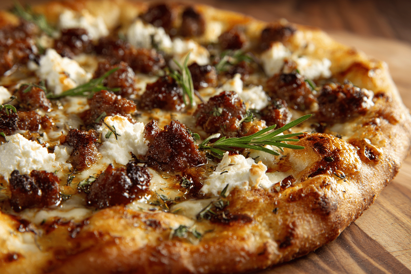 Sausage Ricotta Honey Hot Pizza brings together savory Italian sausage, creamy ricotta, melted mozzarella, and a drizzle of warm honey for a balanced sweet-heat experience. The contrast of salty, rich toppings with a touch of sweetness creates a layered flavor that feels comforting yet dynamic.